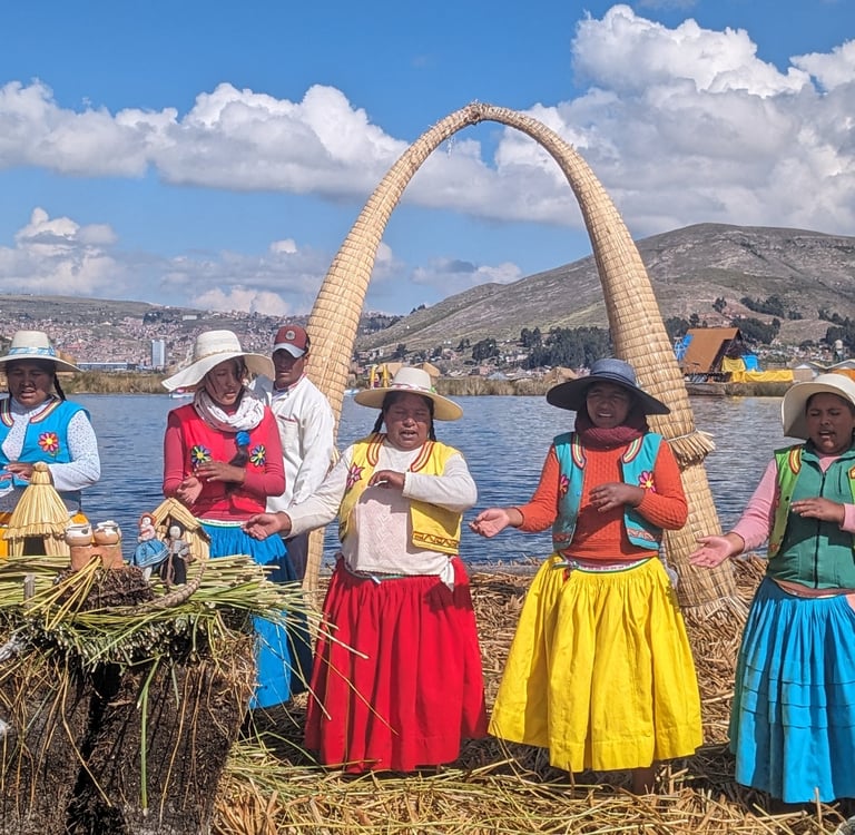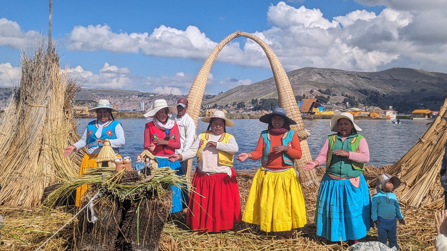 Pour célébrer nos retrouvailles, nous avions réservé un lieu assez incroyable : les îles Uros, une communauté vivant directement sur le lac. Ici, tout est fait de main d’homme : les îles sont entièrement construites à partir de roseaux, superposés en couches pour former de véritables îles flottantes capables de supporter maisons et habitants.