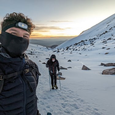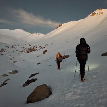 Après une très courte nuit, on se réveille dans le froid à 2h du matin. On s'habille avec des vêtements chauds, on s'équipe de chaussures d'alpinisme, puis on monte dans la voiture de Mario pour nous rapprocher au plus prêt de l'Acotango. Comme pour beaucoup d'ascensions de sommets en haute altitude, il est fortement recommandé de démarrer en pleine nuit pour arriver au sommet au petit matin. Ainsi, le soleil n'aura pas le temps de trop réchauffer l'atmosphère et de faire fondre la glace, ce qui peut rendre instable le terrain et être dangereux.