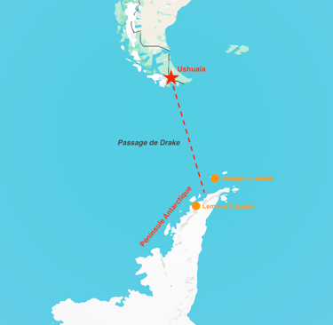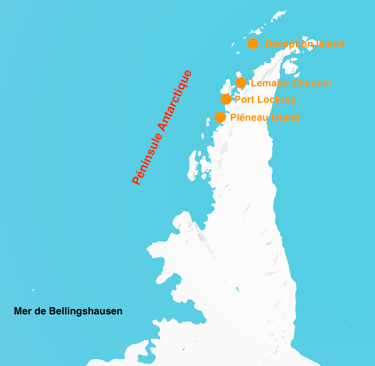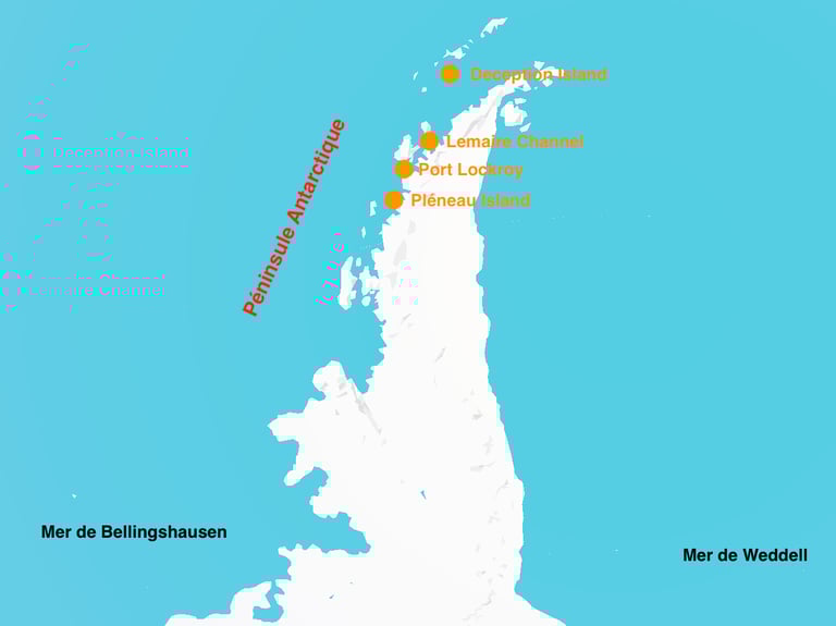 Quelques destinations que vous êtes susceptibles de visiter, selon les conditions de navigation : Lemaire Channel, Pléneau Island, Port Lockroy, Paradise Bay, Neko Harbor...
