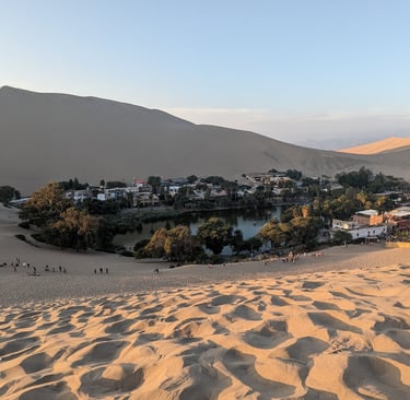 Explorez le désert péruvien à travers deux sites emblématiques et contrastés : les mystérieuses lignes de Nazca et l’oasis de Huacachina. Survolez les géoglyphes millénaires de Nazca, dont les formes gigantesques et énigmatiques continuent de fasciner et de défier le temps. Puis laissez-vous envoûter par l’oasis de Huacachina, un véritable havre de verdure au milieu des dunes dorées du désert d'Ica.