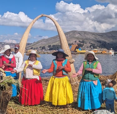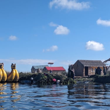 Pour célébrer nos retrouvailles, nous avions réservé un lieu assez incroyable : les îles Uros, une communauté vivant directement sur le lac. Ici, tout est fait de main d’homme : les îles sont entièrement construites à partir de roseaux, superposés en couches pour former de véritables îles flottantes capables de supporter maisons et habitants.
