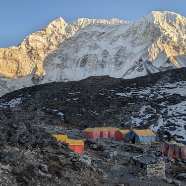Petite journée pour vous rapprocher au plus proche de l'Island Peak. Vous dormirez dans une tente au camp de base au pied de la montagne.